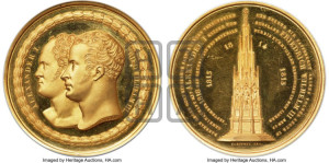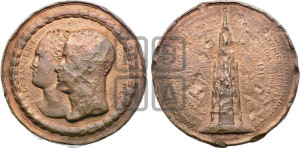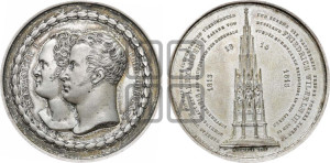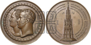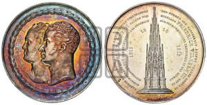 Реверс: DANKBAR GEGEN GOTT EINGEDENK SEINER TREUEN VERBÜNDETEN - UND EHREND DIE TAPFERKEIT SEINES VOLKES LEGTE IN | GEMEINSCHAFT MIT ALEXANDER I KAISER VON - RVSSLAND FRIEDRICH WILHELM III DEN 19 | SEPTEMBER 1818 DEN GRUNDSTEIN DES DENKMALS - FÜR DIE RUHMVOLLEN EREIGNISSE IN DEN IAHREN -1813 - 1814 - 1815