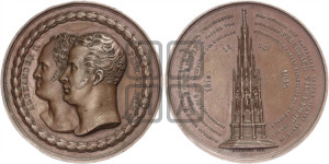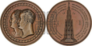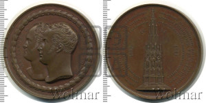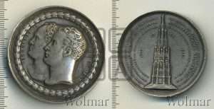 Перевод реверса: В благодарение Богу, в воспоминание своих верных союзников и в честь мужества своего народа Фридрих Вильгельм III положил вместе с Александром I, императором всероссийским, 19 сентября 1818 года основание памятника знаменитым событиям 1813, 1814 и 1815 годов