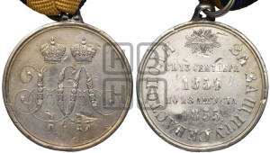 Описание реверса: Под лучезарным Всевидящим оком четырехстрочная надпись СЪ 13 СЕНТЯБРЯ | 1854 | ПО 28 АВГУСТА | 1855 .