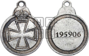Описание аверса: На лицевой стороне вдавленный Орденский Крест с расширяющимися лопастями, обрамленный вдавленным широким кругом. Сверху круг увенчивался императорской короной и ушком, с пробитым в нем отверстием для ношения. Крест залит красной эмалью