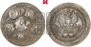 Описание аверса: На фоне лавровых и дубовых ветвей под увенчанным Императорской короной двуглавым орлом, с распростертыми крыльями, груглые барельефы с портретами: в центре Петра I, на равном удалении друг от друга по окружности Николая II, Александра I, Павла I, Марии Федоровны и Александры Федоровны, по обе стороны от барельефа с портретом Павла I ордена, внизу подпись Н .ДМИТРИЕВЪ