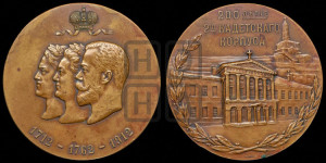 Описание аверса: Влево обращенные один за другим бюсты Императоров Николая II, Петра I и Императрицы Екатерины II, над ними Императорская корона с лентами, на обрезе шеи Николая II инициалы А . А . Г . (А.А. Грилихес). Под бюстами даты