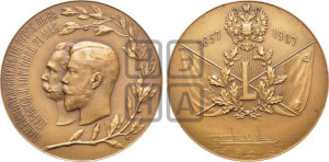 Описание реверса: В центре на двух накрест расположенных трехцветных флагах венок из дубовых ветвей внутри которого в сиянии цифра L. Вверху Российский Государственный герб между датами 1857-1907, внизу идущий по морю двухмачтовый пароход