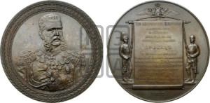 Описание аверса: В обрамлении сплошного венка погрудный портрет в.к. Владимира Александровича в генеральском мундире, с аксельбантом, цепью ордена Св. Андрея Первозванного на груди, орденскими звездами, орденами и медалями, под портретом подпись Н . ДМИТРİЕВЪ