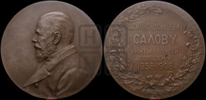 Описание реверса: В обрамлении круговой надписи и венка из дубовых и лавровых ветвей пятистрочная надпись ВАСИЛİЮ ВАСИЛЬЕВИЧУ | САЛОВУ | ИНЖЕНЕРУ ПУТЕЙ | СООБЩЕНİЯ | 1858-1908 Г . Справа под венком инициалы A. В . (А. Васютинский)
