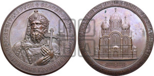 Описание аверса: В обрамлении круговой надписи портрет князя Владимира в княжеской короне, царском одеянии, кружевной мантии, с четырехконечным крестом в руках, справа на постаменте фасад Владимирского собора в Киеве. Справа на постаменте подписи ПРОФ . А . ПРАХОВЪ . - В . НИКОНОВЪ . Р . (Профессор А. Прахов. В. Никонов резал)