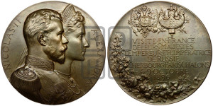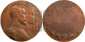 Описание аверса: Вправо обращенные один за другим погрудные портреты Императора Николая II, в военном мундире, эполетами с вензелевым именем Императора Александра III, с аксельбантом, медалями на груди, орденской лентой через правое плечо, и Императрицы Александры Федоровны с деадемой на голове, бусами и кулоном на шее, на обрезе подпись J • С • CHAPLAIN