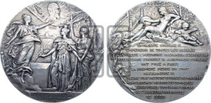 Описание аверса: Под сияющим бюстом Александра III, расположенного на полотне, аллегорические изображения: России, Франции и Парижа, в образе женских фигур, Франции и Парижа в античных одеяниях, России в царском облачении, с Императорской короной на голове, цепью ордена Св. Андрея Первозванного на груди и молотом в руке. За ними справа знамя с наградной лентой, слева мост и мемориал