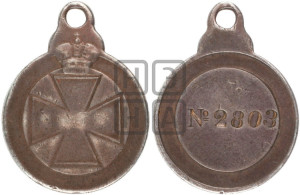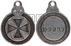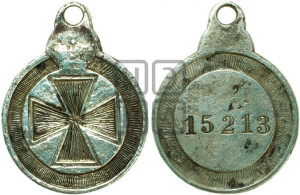 Описание аверса: На лицевой стороне вдавленный Орденский Крест с расширяющимися лопастями, обрамленный вдавленным широким кругом. Сверху круг увенчивался императорской короной и ушком, с пробитым в нем отверстием для ношения. Крест залит красной эмалью