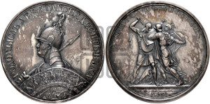Описание реверса: Слева вооруженный воин, прикрыв от ударов мечей грудь овальным щитом с изображением двуглавого орла, копьем отбивается от двух противников, третий, пораженный лежит на земле