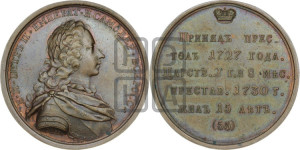 Реверс: ПРИНЯЛЪ ПРЕС- | ТОЛЬ 1727 ГОДА. | ЦАРСТВ. 2 Г. И 8 МѢС. | ПРЕСТАВ. 1730 Г. | ЖИЛЪ 15 ЛѢТЪ . | (55)