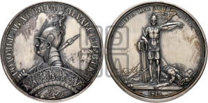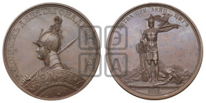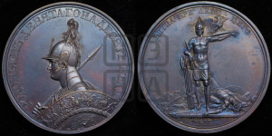 Описание реверса: Русский воин стоит на поле битвы; в простертой левой его руке щит, на котором сидит двуглавый орел с распущенными крыльями; правая воина рука, покоясь на связке секир, держит меч. Поле покрыто разбросанным оружием и трупами павших воинов