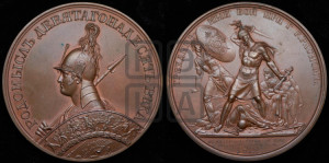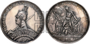 Описание реверса: Русский воин в кольчуге и шлеме готовится поразить мечом обезоруженного и бегущего противника, прикрывающегося щитом с изображением французского императорского герба; в левой руке русского воина два меча, отнятые у побежденных врагов, изображенных справа на втором плане коленопреклоненными с закрытыми руками лицами; четвертый враг лежит на земле, на которой брошены неприятельское знамя с поломанным древком, шлем и сломанный меч
